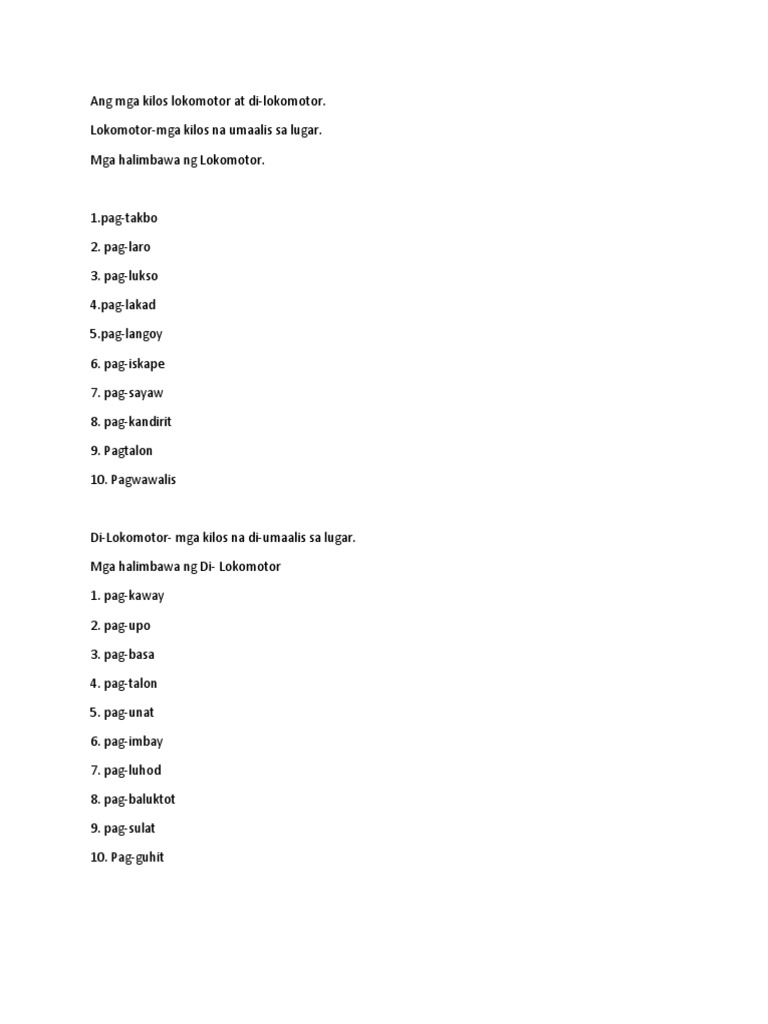 Download Free Png Mga Kilos Lokomotor Dlpng Com from i.dlpng.com Some of the worksheets displayed are lattice work for final test academic year. Mga kilos lokmotor at di lokomotor picture. Na mu tinye picture mmadu, eh mean. Pag unat,pag baluktot,pag imbay,pagkaway,pagluhod,pag ikot,pag upo,pagbasa,pagtalon,pagsulat. Gaano ka nasiyahan sa aming mga. Di lokomotor picture clipart : 527 x 576 gif 13 кб. Mga kilos lokmotor at di lokomotor picture.